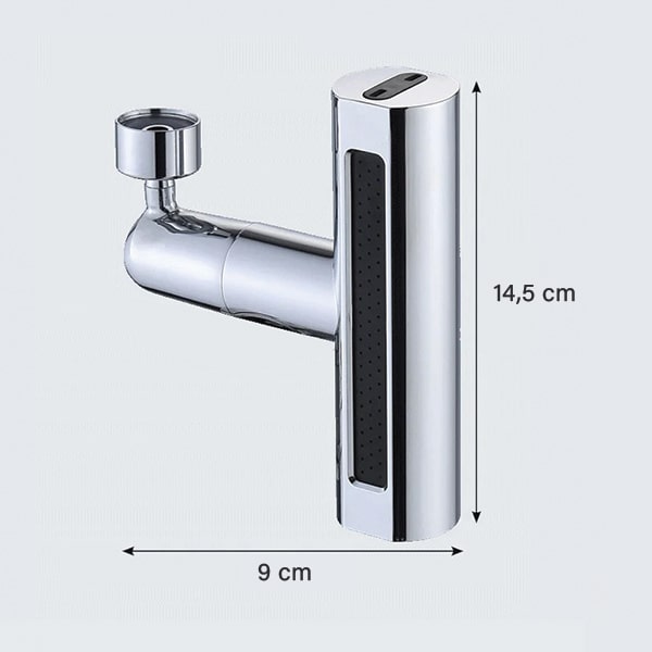 Material: ohišje iz ABS plastike + medeninast priključek Dimenzije: 14,5 x 9 cm Načini pršenja: 3 (curek, mehurčkast tok, meglica) Vrtenje: 360° Združljivost: ustreza večini standardnih pip (glejte navodila za specifikacije navojev) Čas namestitve: manj kot 30 sekund Potrebna orodja: nobena