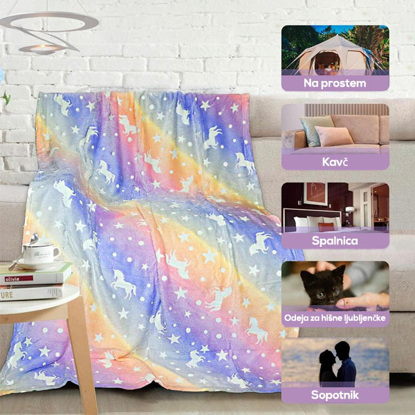 Prijetna in topla odeja ponoči oddaja svetlobo! Izberete lahko vzorec samoroga ali dinozavra!