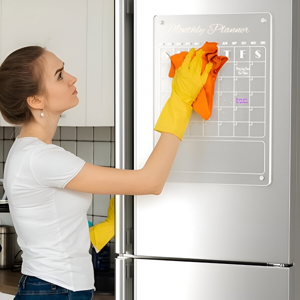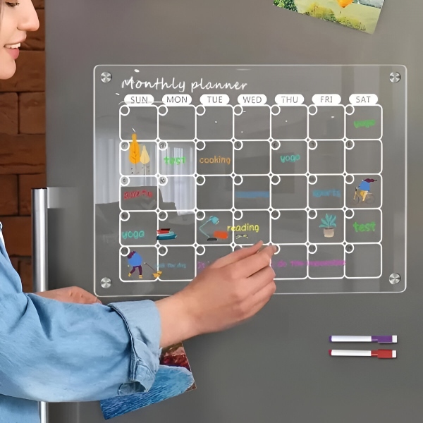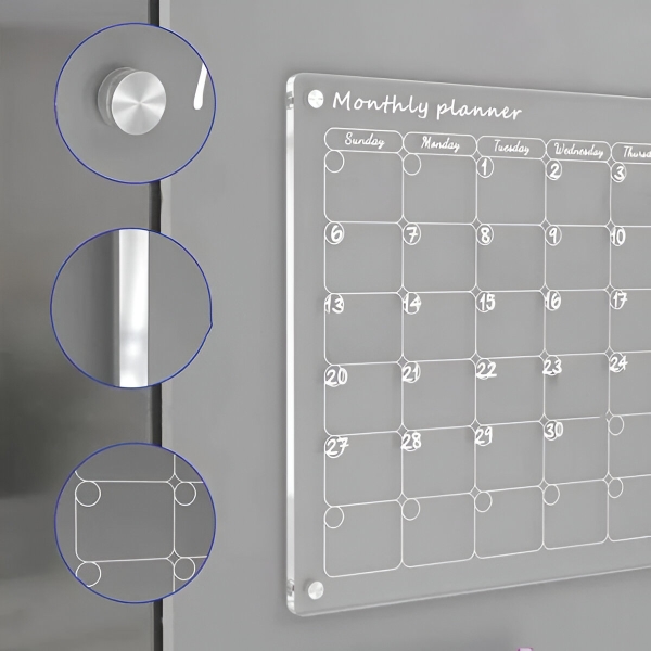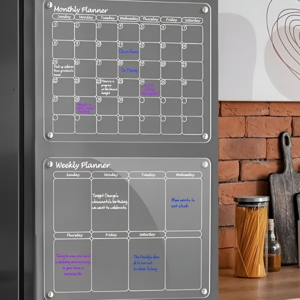 Papirnati planerji po enem mesecu poidejo in gredo naravnost v smeti. Prozorna akrilna površina se popolnoma obriše v nekaj sekundah s priloženo krpo – brez sledi, brez madežev, brez ostankov. Površina je odporna na praske in madeže, tako da ostane kristalno čista po stotinah brisanj.